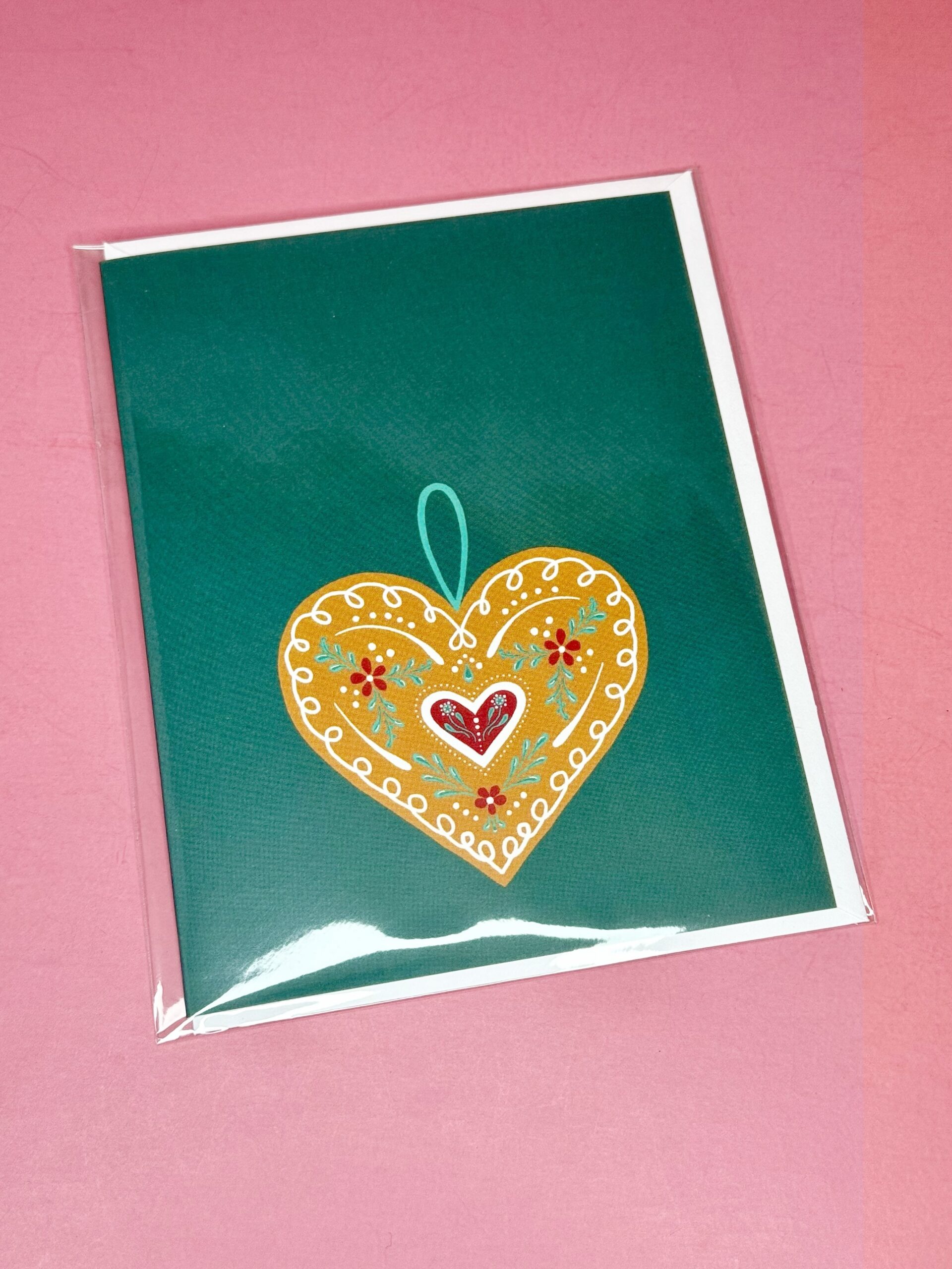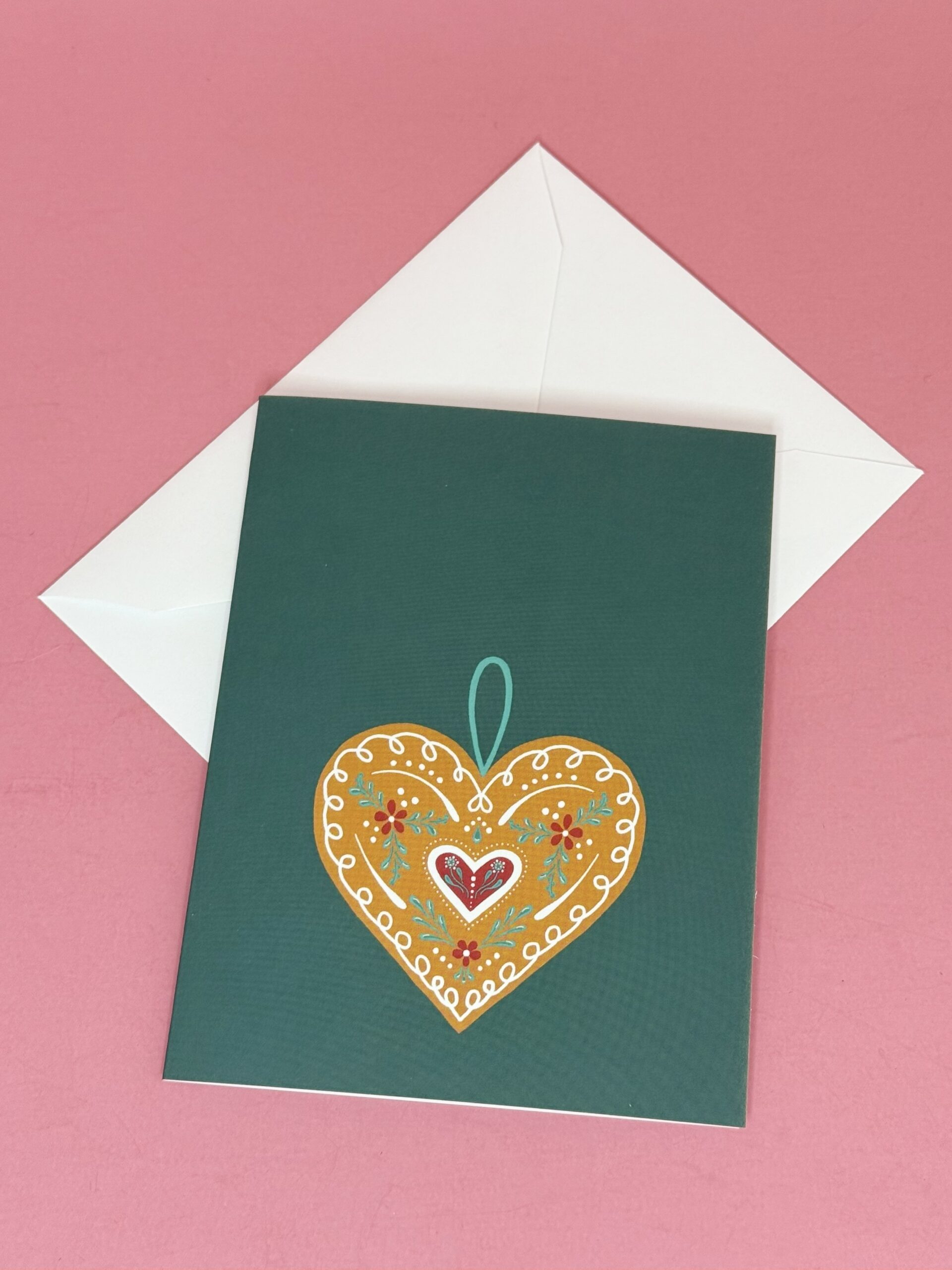 Inspired by German gingerbread hearts, I designed this Christmas card with one big gingerbread heart on a green background.