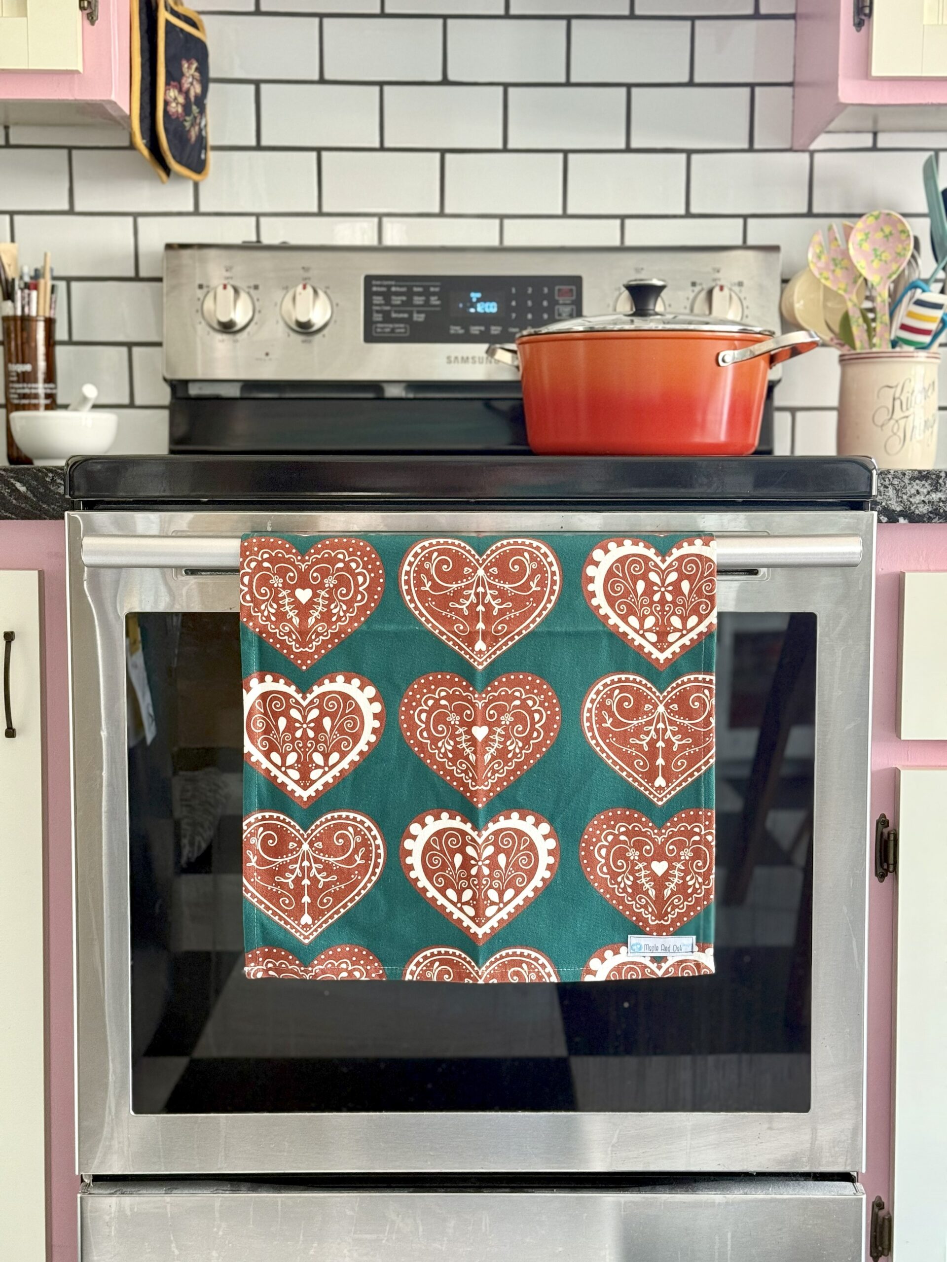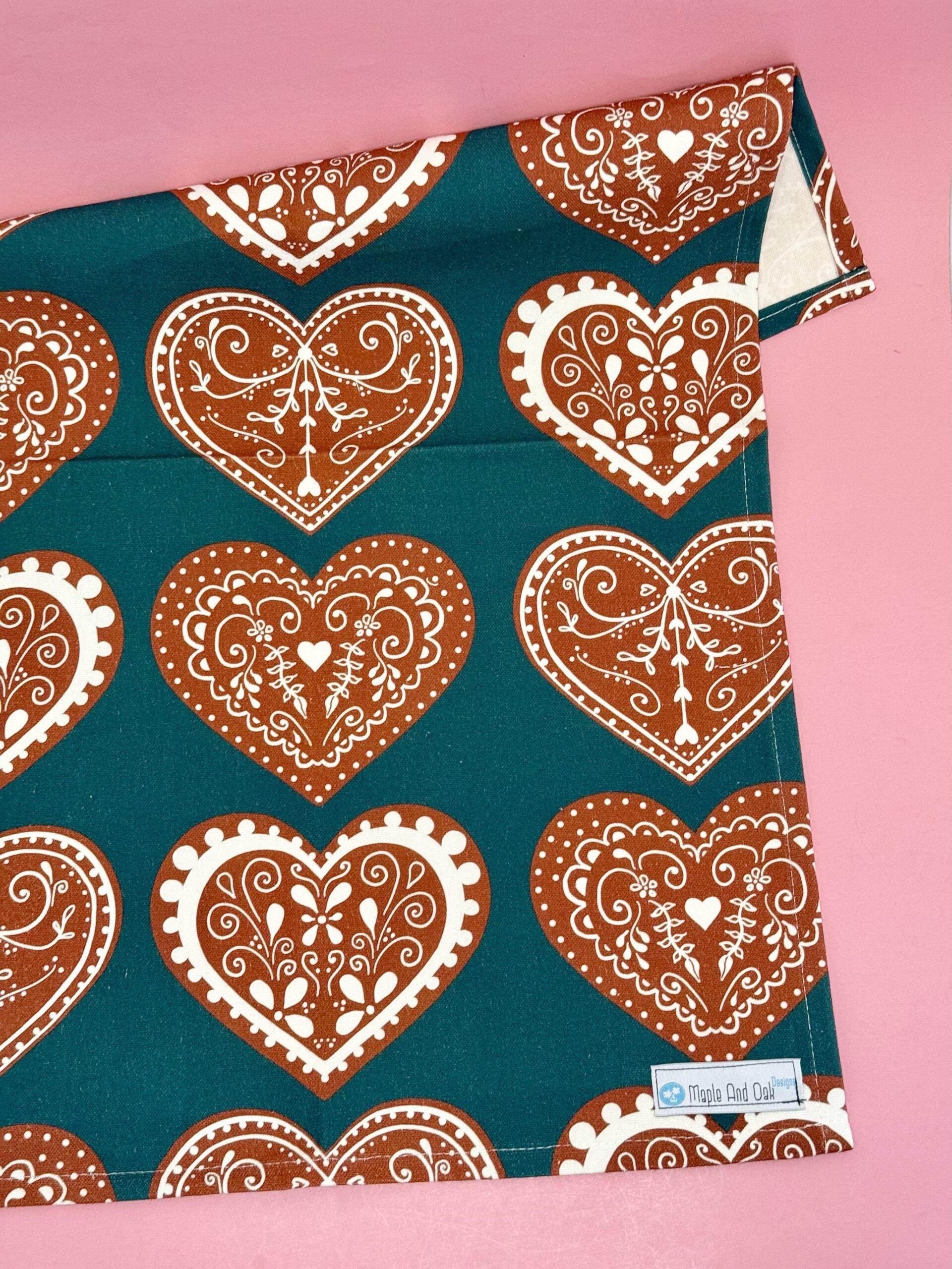Inspired by Lebkuchen Herzen – gingerbread hearts green, I designed this tea towel with a variety of Lebkuchen Herzen – gingerbread hearts from Germany. I recently started drawing and designing my own patterns. They are printed on fabric and sewn into tea towels in Montreal, Quebec.