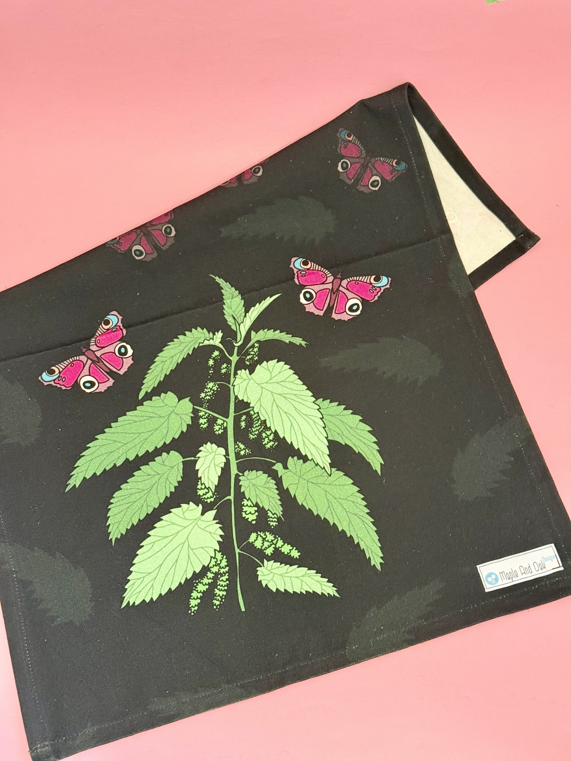 Nettles and pink Butterflies – tea towel