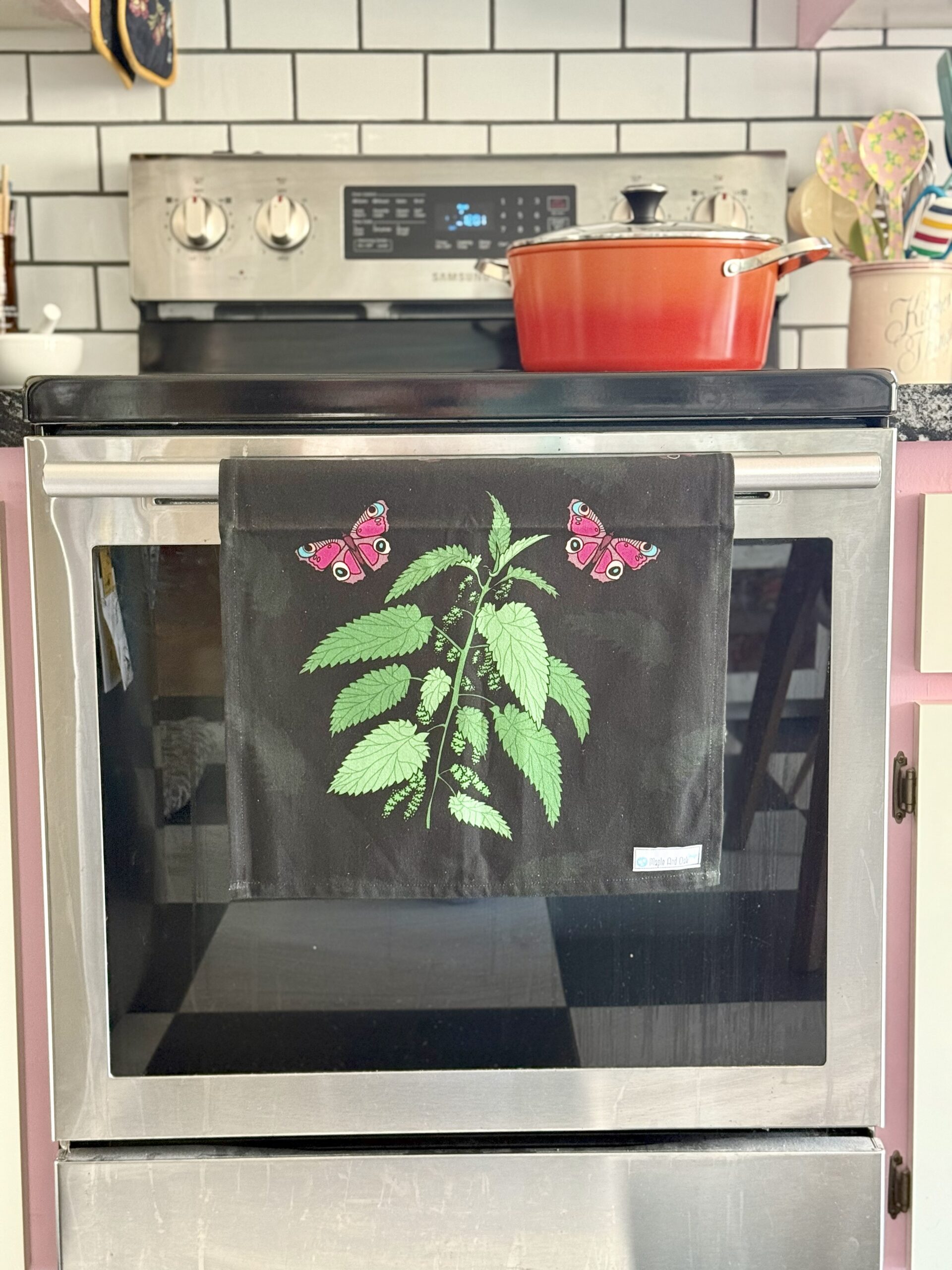 Inspired by nature, I designed this tea towel with nettles and pink butterflies. I recently started drawing and designing my own patterns. They are printed on fabric and sewn into tea towels in Montreal, Quebec.
